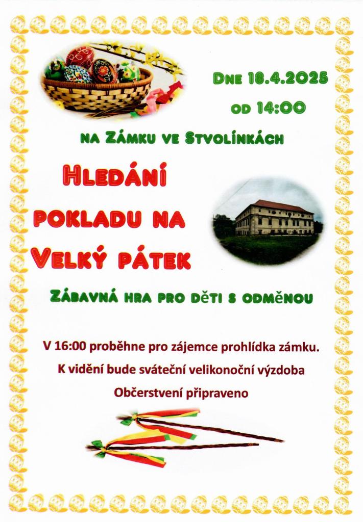 Zveme Vás na zámek ve Stvolínkách, dne 18.04.2025 od 14.00 hod. hledáme velikonoční poklad. Zábavná hra pro děti s odměnou. Pro zájemce bude umožněna prohlídka zámku od 16.00 hod. Více v příloze.