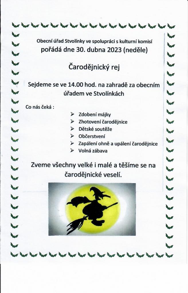 Obecní úřad ve spolupráci s kulturní komisí pořádá dne 30.04.2023 "Čarodějnický rej". Více v příloze