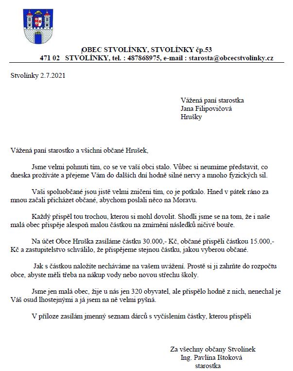 Dopis, který jsme zaslali obci po tornádu, o příspěvku naší obce a našich obyvatel
