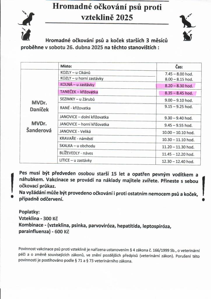 Hromadné očkování psů a koček proti vzteklině proběhne v sobotu 26.dubna 2025. Platí pro obyvatele Kolné a Tanečku. Více v příloze.