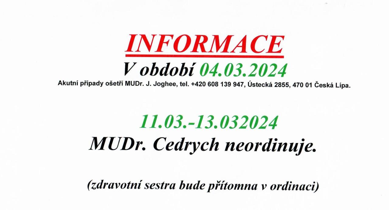 Aktuální informace - Informace-MUDr.Cedrych, uzavření ordinace, 4.3.24 a 11.3.-13.3.24