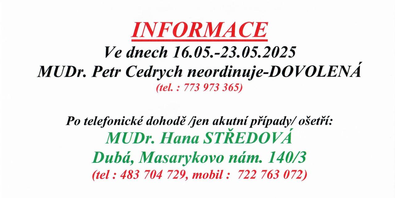 Aktuální informace - Informace-uzavření ordinace praktického lékaře MUDr.Cedrycha 16.05.-23.05.2025