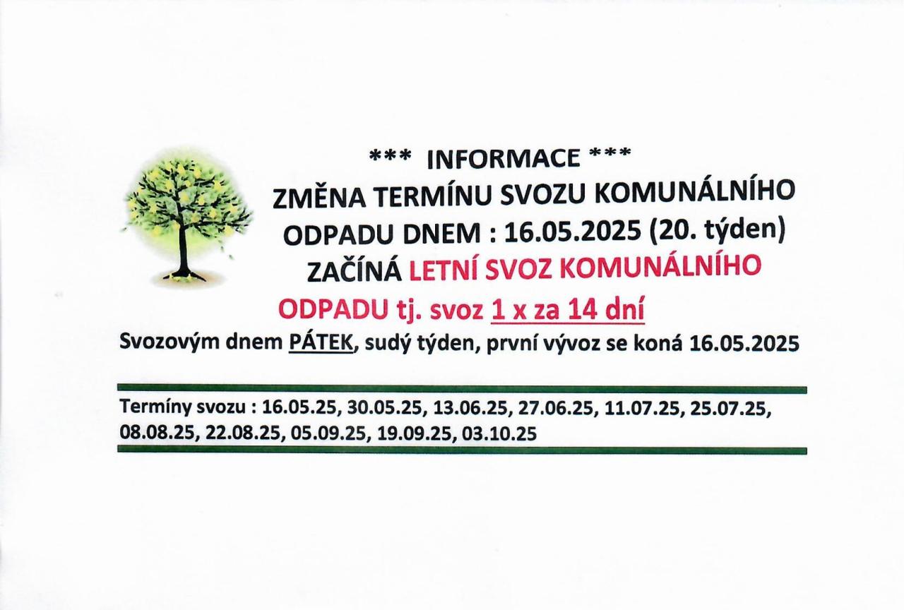 Dnem 16.05.2025 začíná LETNÍ svoz komunálního odpadu, tj. svoz 1 x za 14 dní. Svozovým dnem je pátek, sudý týden.První vývoz se koná 16.05.2025. Příloha.