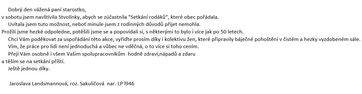 Chci Vám poděkovat za uspořádání této akce, vyřiďte prosím díky i kolektivu žen, které připravily báječné pohoštění v čistém a hezky vyzdobeném sále.