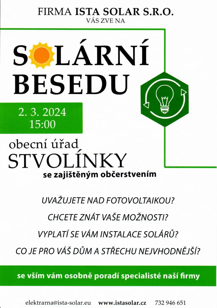Solární beseda-zvažujete fotovoltaiku? Poradí specialisté s firmy ISTA SOLAR s.r.o. Sobota 02.03.2024 od 15.00 hod.,obecní úřad Stvolínky. Více v příloze.