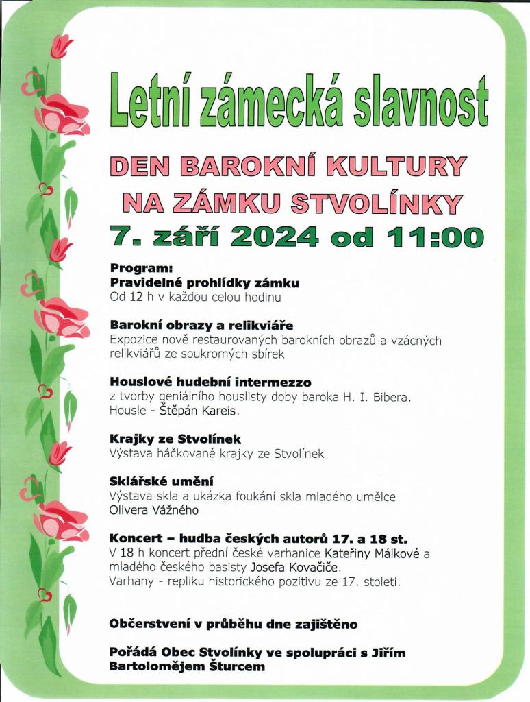 Obec Stvolínky ve spolupráci s Jiřím Bartošem Šturcem zve na Letní zámeckou slavnost (Den barokní kultury), která se koná dne 7. září 2024 od 11. hod.na zámku ve Stvolínkách. Více v příloze.