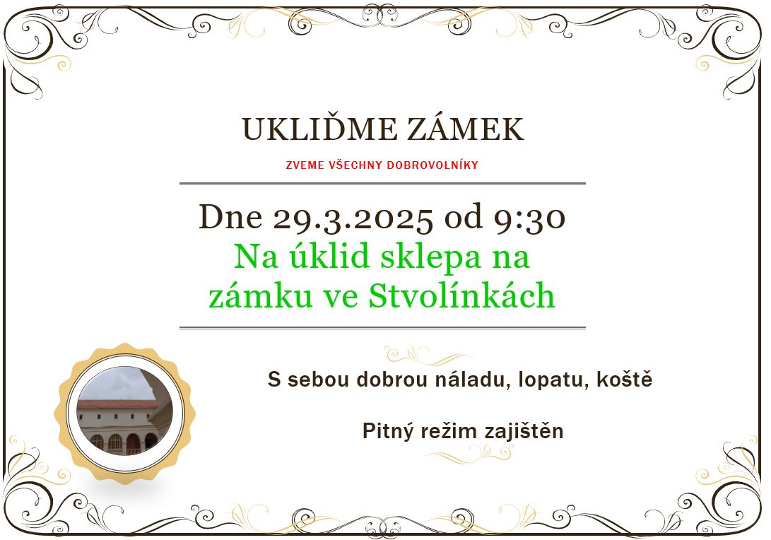 Dobrovolníci ukliďme zámek ve Stvolínkách! Sejdeme se v sobotu 29.03.2025 v 9.30 hod. na zámku ve Stvolínkách. Více v příloze.